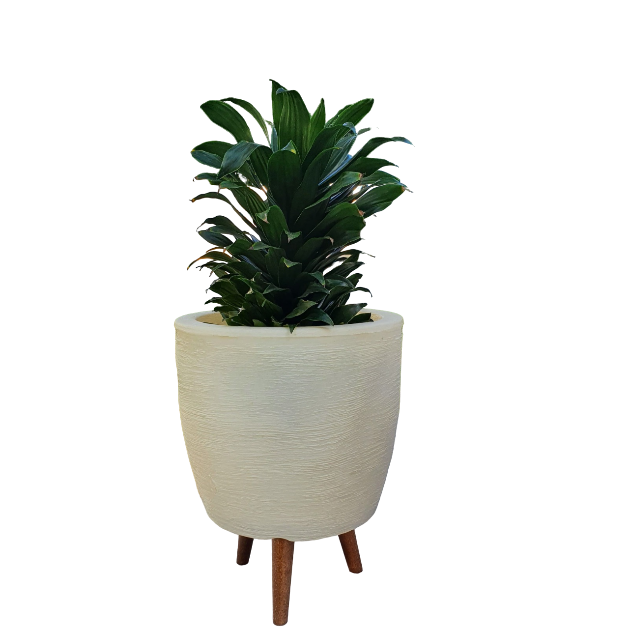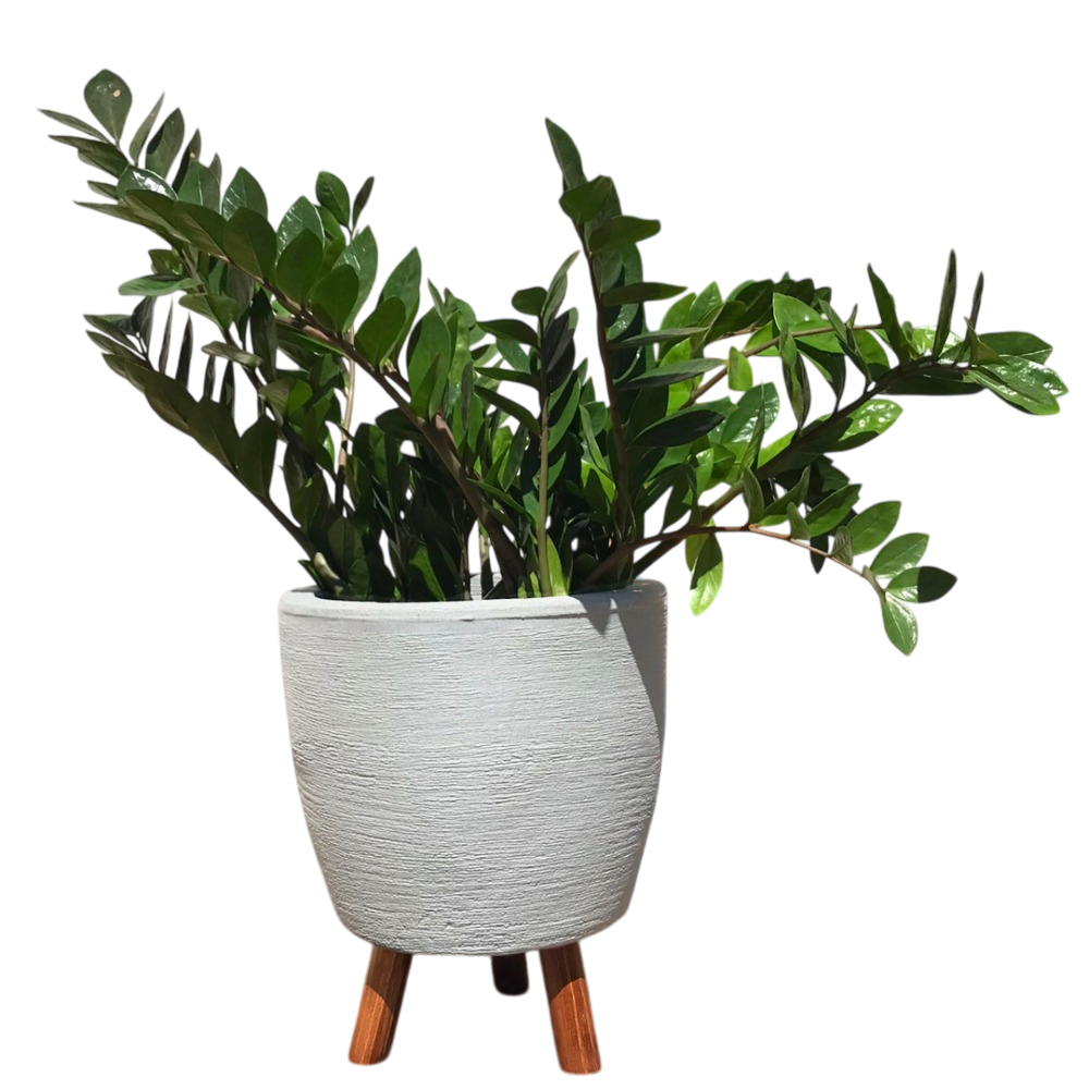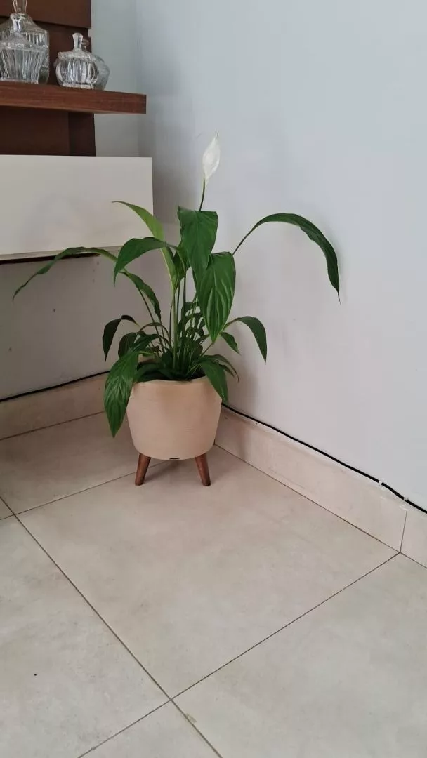 🌿 Presença visual natural — o tripé de madeira realça a planta como se fosse uma obra de arte viva